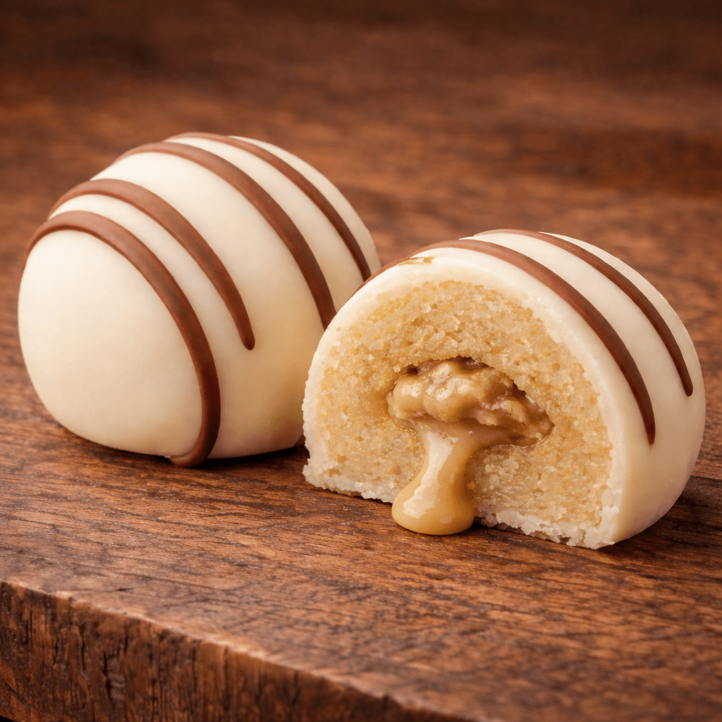 A klasszikus Eszterházy torta diós ízvilága köszönt vissza ebben a marcipánunkban, melyet fehér csokoládéba mártva kínálunk.